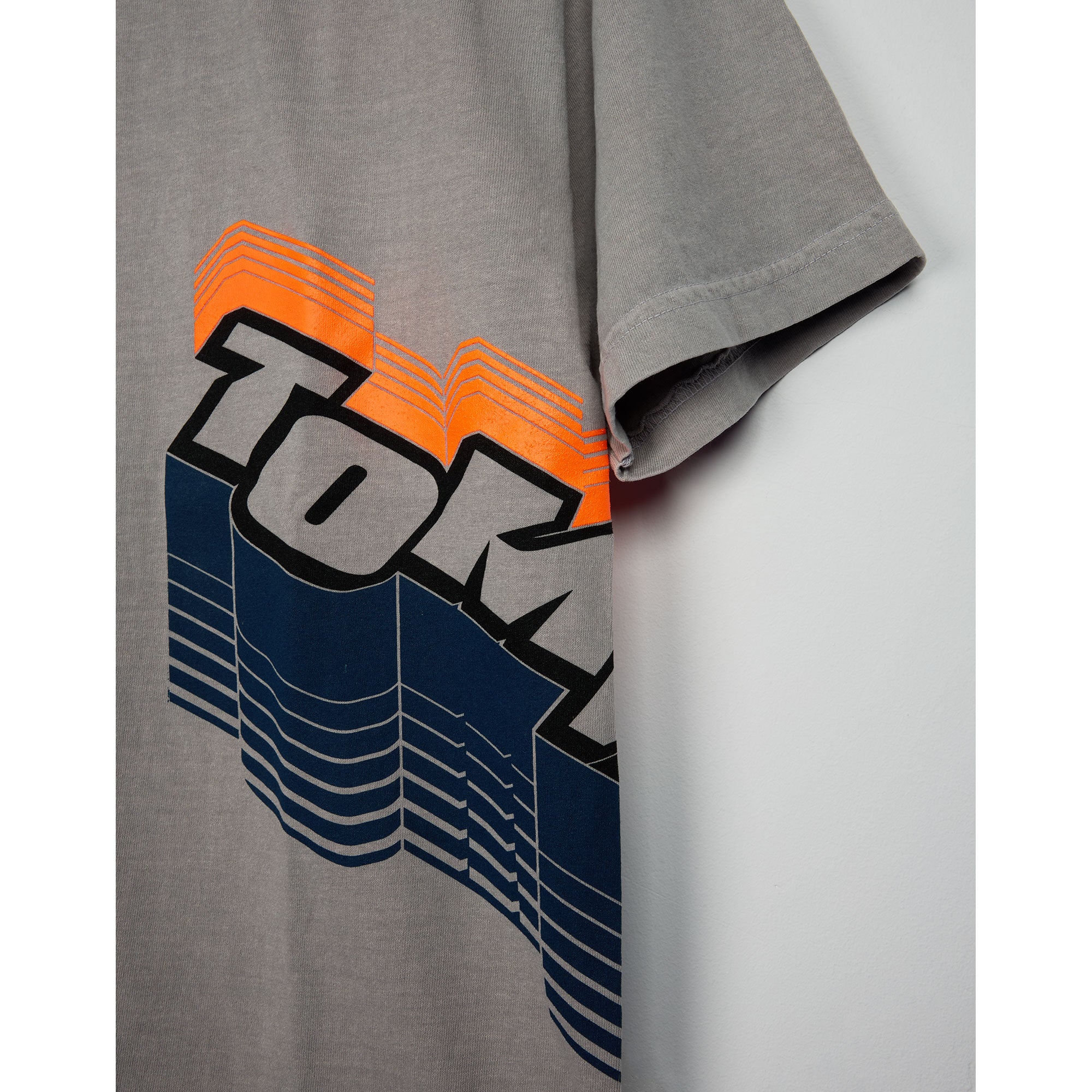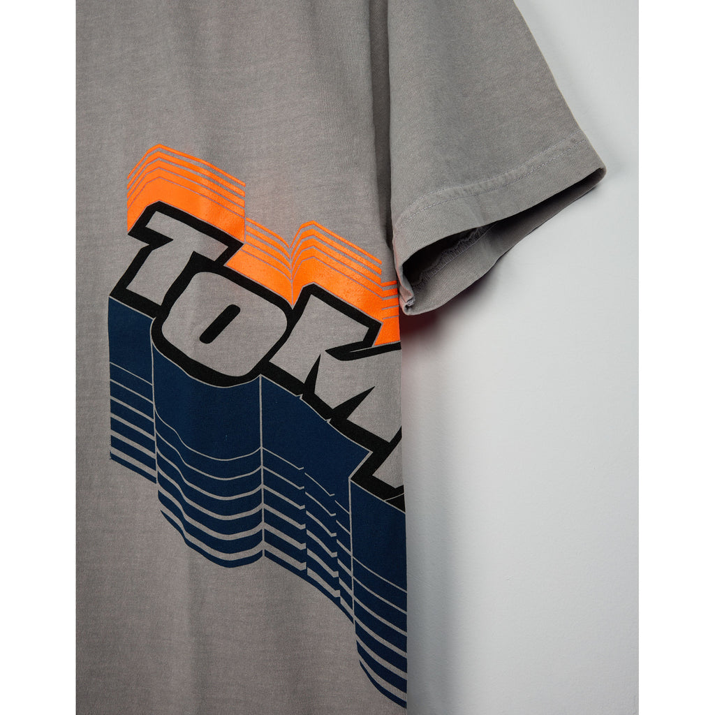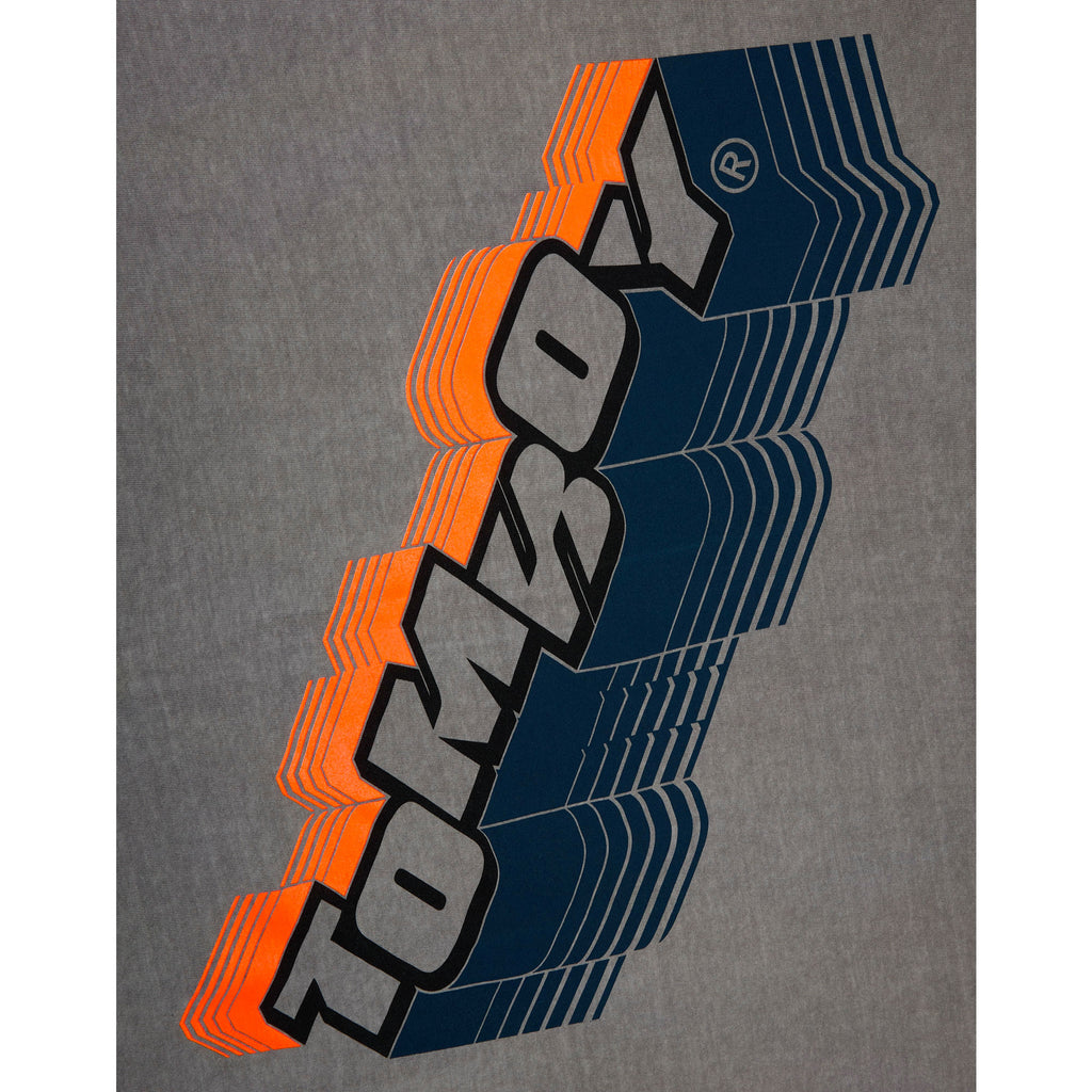 - COULEURS : JERSEY GRIS TIE & DYE AVEC IMPRIMÉ NOIR, BLEU MARINE & ORANGE FLUO